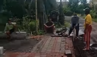 Sebelumnya, warga menyusun ratusan paving blok yang tergeletak di pinggir jalan menjadi bangunan menyerupai candi. Aksi itu dilakukan sebagai bentuk kekecewaan karena material proyek tak kunjung dipasang dan justru menghambat akses jalan kampung.
