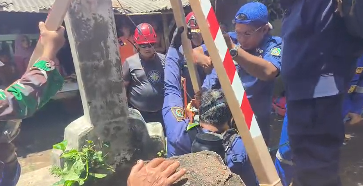 Evakuasi Korban Jatuh ke Sumur 15 Meter di Patoman Banyuwangi,Petugas Damkar Mat Bahu-membahu Menangani Kejadian.