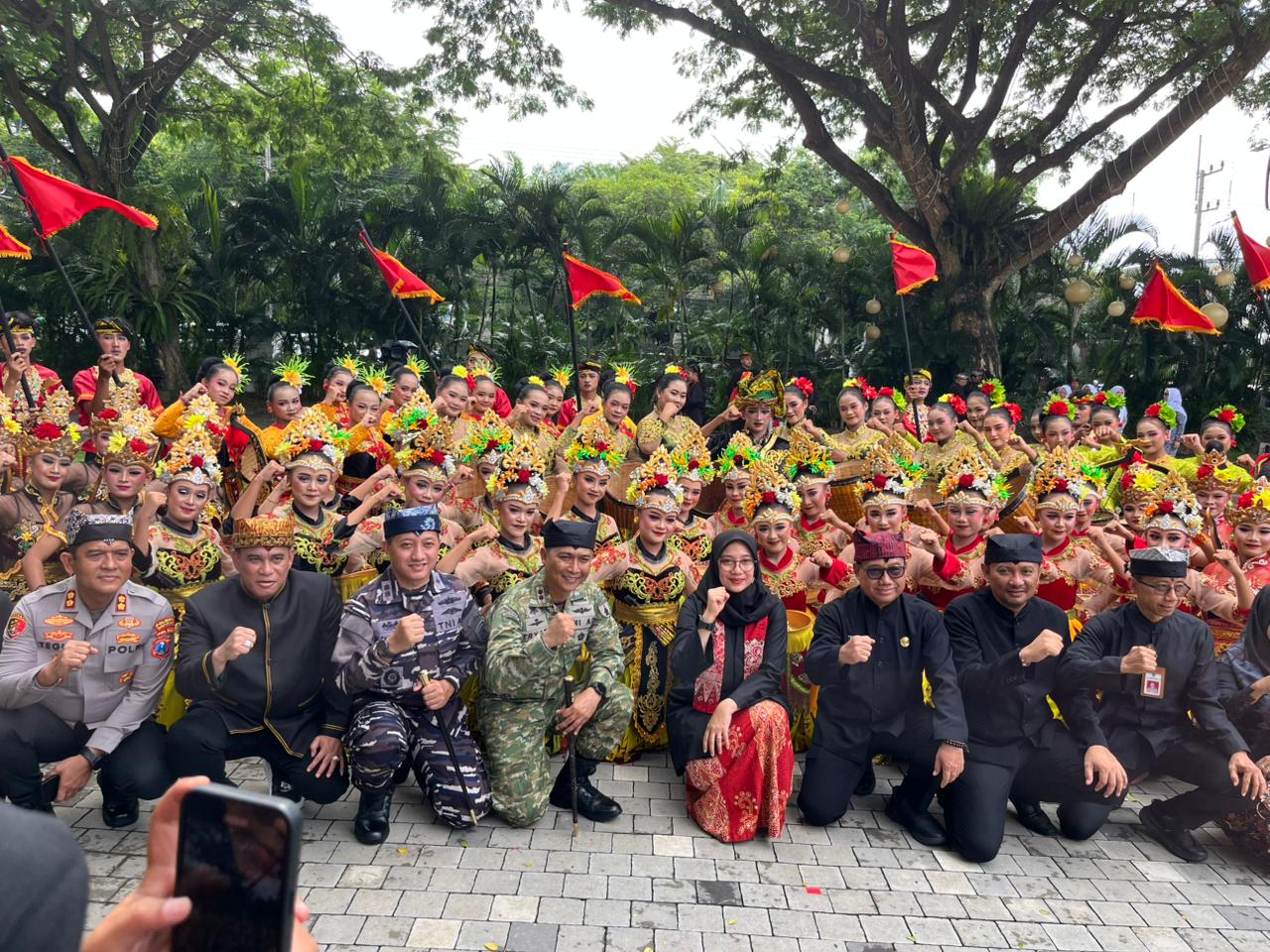 Ratusan siswa SMP dan SMA juga menampilkan tari kolosal khas Banyuwangi. Usai upacara, Bupati Ipuk sarapan bareng berbagai elemen masyarakat mulai tukang becak, pesepeda dan ojol.