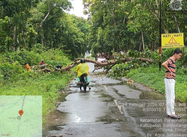 BANYUWANGIHITS.ID – Cuaca ekstrem berupa hujan deras yang disertai angin kencang melanda wilayah Kecamatan Purwoharjo pada Sabtu (14/02/2026), mengakibatkan sebuah pohon jati milik Perhutani tumbang dan menutup badan jalan sehingga sementara mengganggu arus lalu lintas. Kejadian ini berlangsung mulai pukul 07.30 hingga 08.30 WIB di Jalan Raya depan TPK Gaul, Desa Grajagan, Purwoharjo.