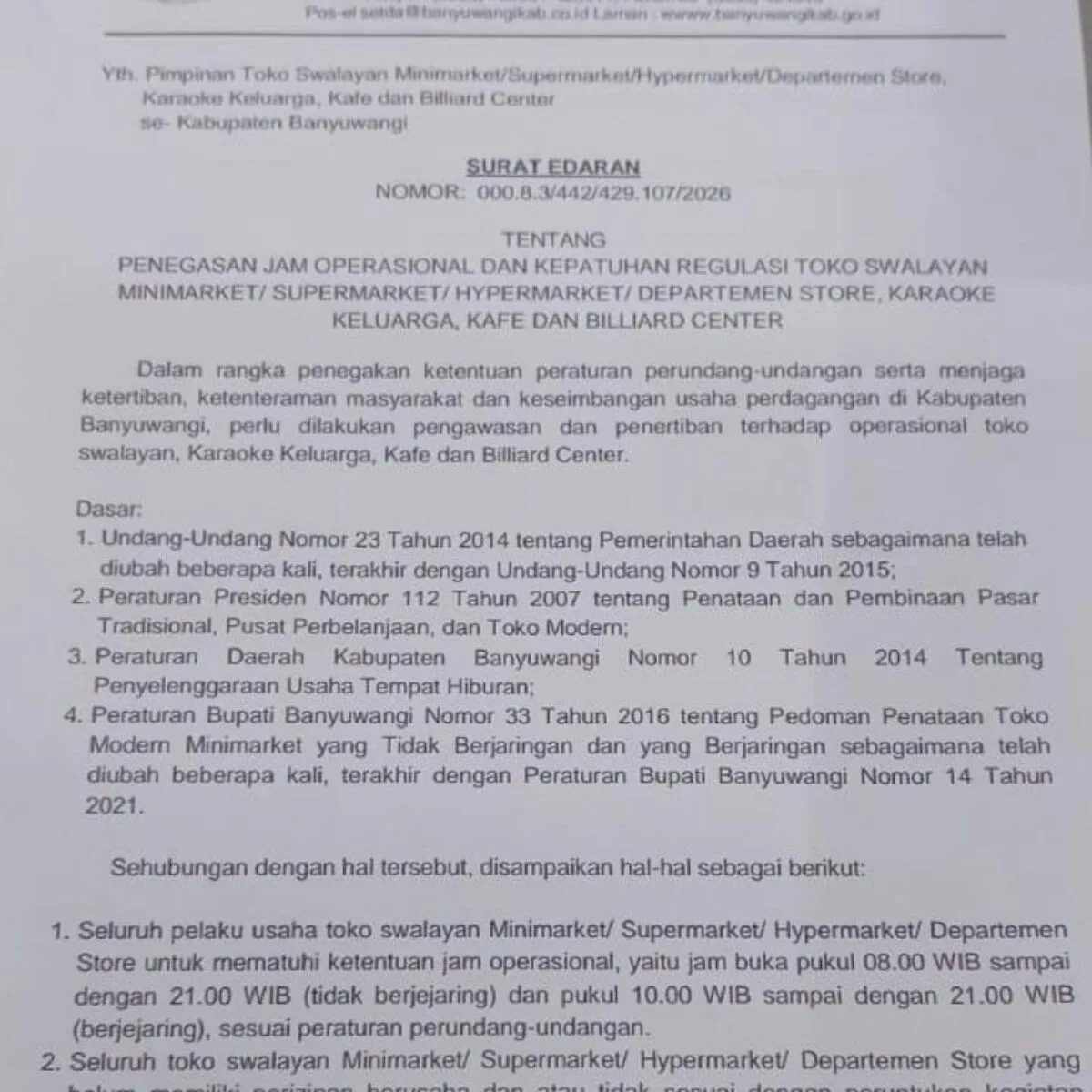 Kebijakan tersebut tertuang dalam Surat Edaran Nomor 000.8.3/442/429.107/2026 yang mengatur penegasan jam operasional sekaligus kepatuhan terhadap regulasi bagi pelaku usaha, mulai dari toko swalayan, minimarket, supermarket, hingga tempat hiburan seperti karaoke keluarga, cafe, dan billiard center.