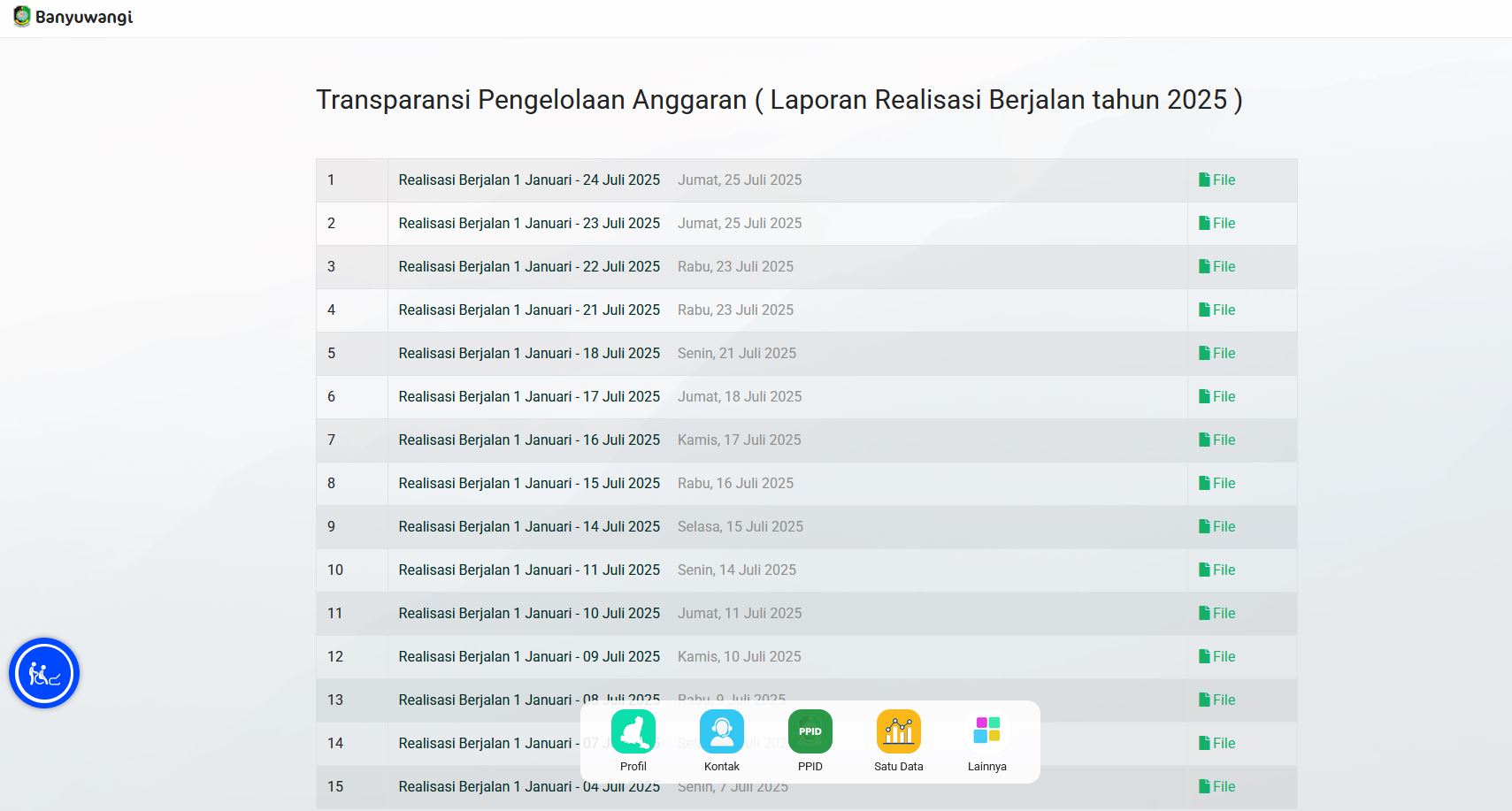 Melalui portal resmi Pejabat Pengelola Informasi dan Dokumentasi (PPID) Kabupaten Banyuwangi di laman PPID Kabupaten Banyuwangi, masyarakat dapat mengakses daftar lengkap program dan kegiatan yang dilaksanakan oleh seluruh Satuan Kerja Perangkat Daerah (SKPD). Informasi yang tersedia mencakup lokasi pelaksanaan, alokasi anggaran, dan capaian pelaksanaan.