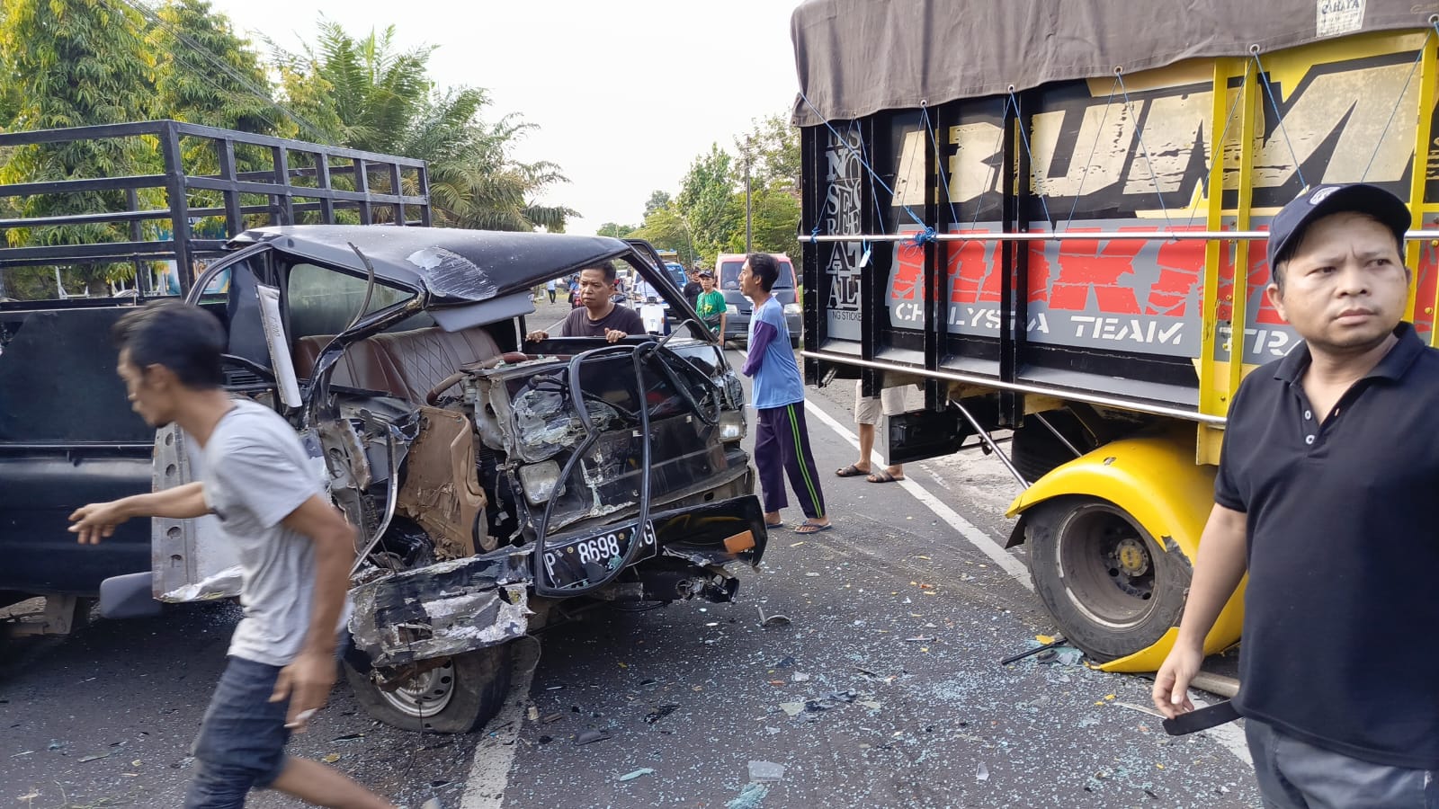 Insiden tersebut melibatkan dua kendaraan, yakni truk Mitsubishi warna kuning bernopol N 9408 YI dan pick-up L300 warna hitam bernopol P 8698 VG.