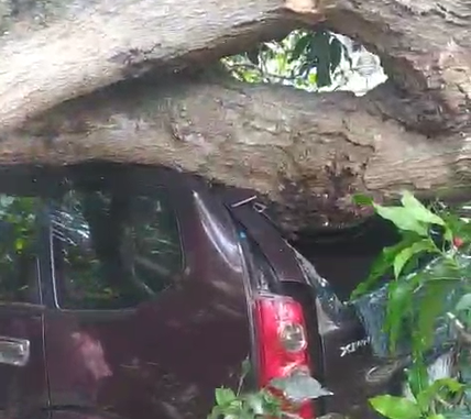 Pohon Mangga Tumbang Timpa Mobil di Kelurahan Sobo Banyuwangi, Petugas Lakukan Evakuasi.