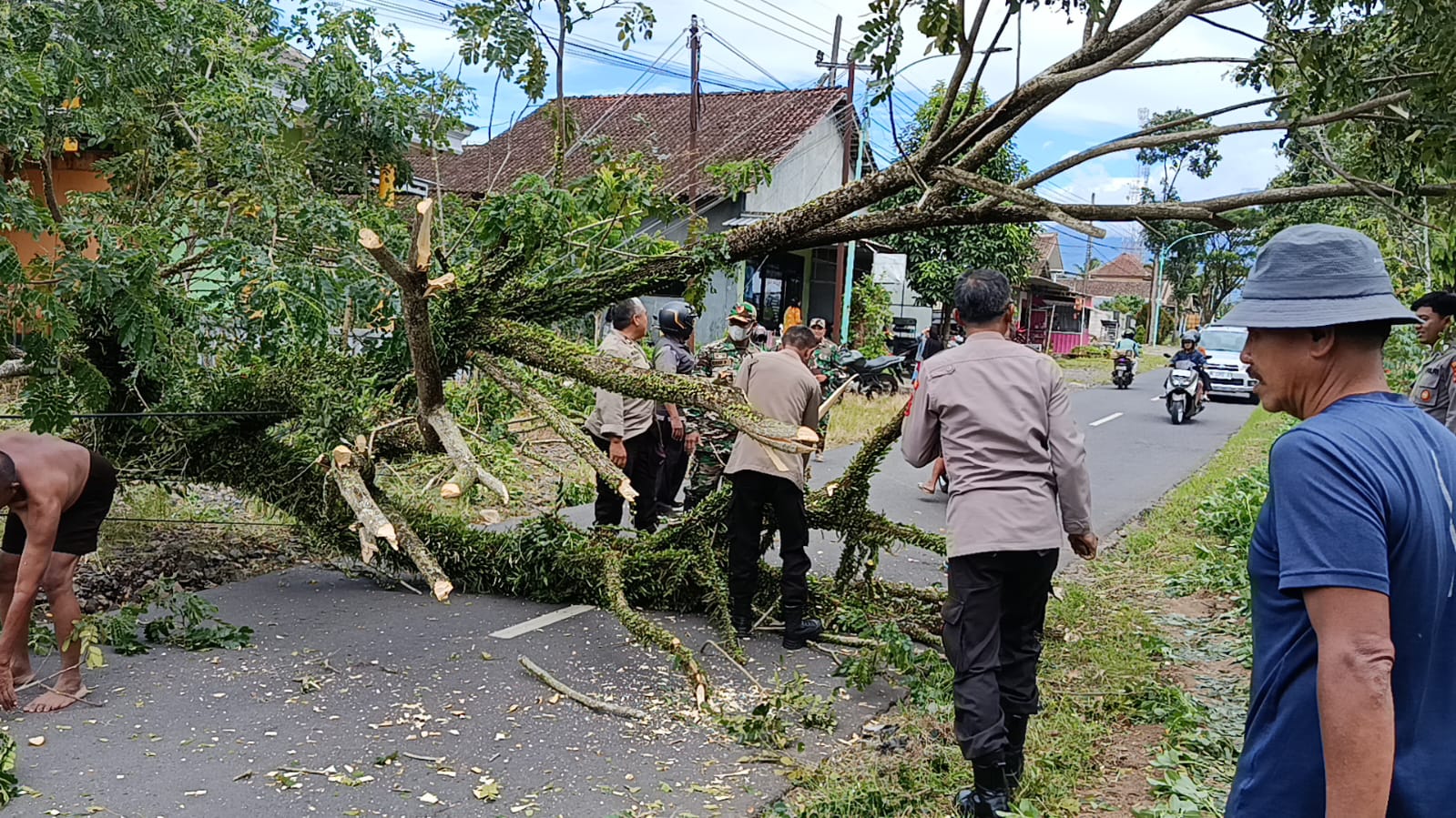 Sinergi TNI-Polri dan Warga Evakuasi Pohon Tumbang di Depan KUD Songgon Pagi Ini.