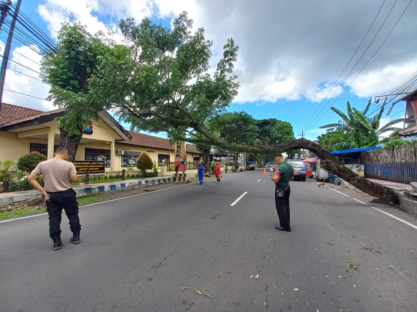 Tim Rescue Damkar dan Polsek Genteng Evakuasi Pohon Tumbang yang Menghambat Arus Lalu Lintas di Jalan KH. Wahid Hasyim Genteng Kulon.