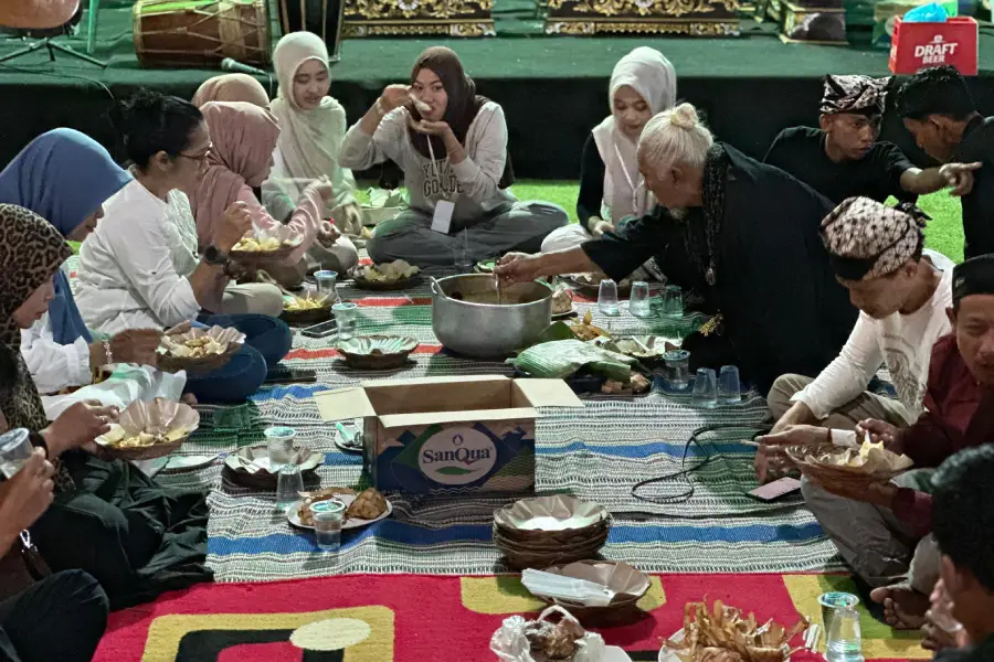 Usai doa, masyarakat mulai menikmati hidangan ketupat yang telah disiapkan sejak siang. Momen makan bersama ini tidak sekadar menjadi ajang santap, tetapi juga sarana mempererat tali silaturahmi antarwarga.