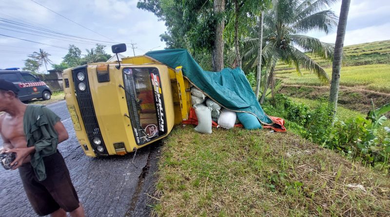 Diduga Hindari Truk dari Arah Berlawanan Truk Engkel Terguling di Kaligondo Genteng.